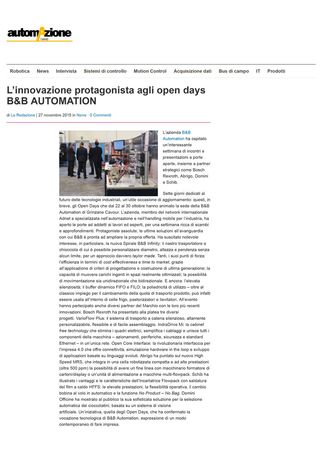 Dicono di noi La stampa riporta il nostro lavoro, permettendoci di confrontare le nostre soluzioni su prestigiose riviste di settore. ARTICOLO SUZoom Gen7Feb 2016 ARTICOLO SUTecnalimentaria ARTICOLO SU Automazionenews.it ARTICOLO SUTracce del pallet ARTICOLO SUProvincia oggi ARTICOLO SUTecnalimentaria Gen 2014 Integratori Bosh 2 ARTICOLO SUTecnalimentaria Lug 2013 ARTICOLONautech 2008 ARTICOLONautech 2009